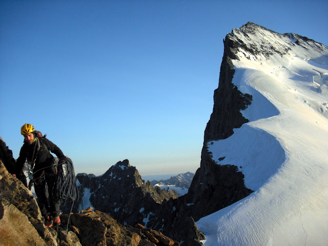 Se sube por una fuerte pendiente de terreno inestable, y luego por el pequeño Glaciar des Barres hasta el pie del pilar. Es otra hora y media larga...