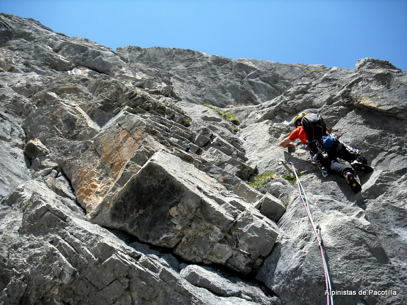 Primer largo, 5c+. Lo empalmamos con el segundo, que es una trepada de II.