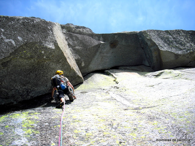 Elegimos la vía "Pata Negra" antes de salir de casa, pero el destino quiere que en la reunión del segundo largo nos liemos y terminemos haciendo la "Tangerine Dream". No sé si salimos ganando o perdiendo, porque las placas de la Pata Negra que vemos a nuestra derecha son espeluznantes, pero el musgo que se ha instalado a vivir en la Tangerine no es más esperanzador...